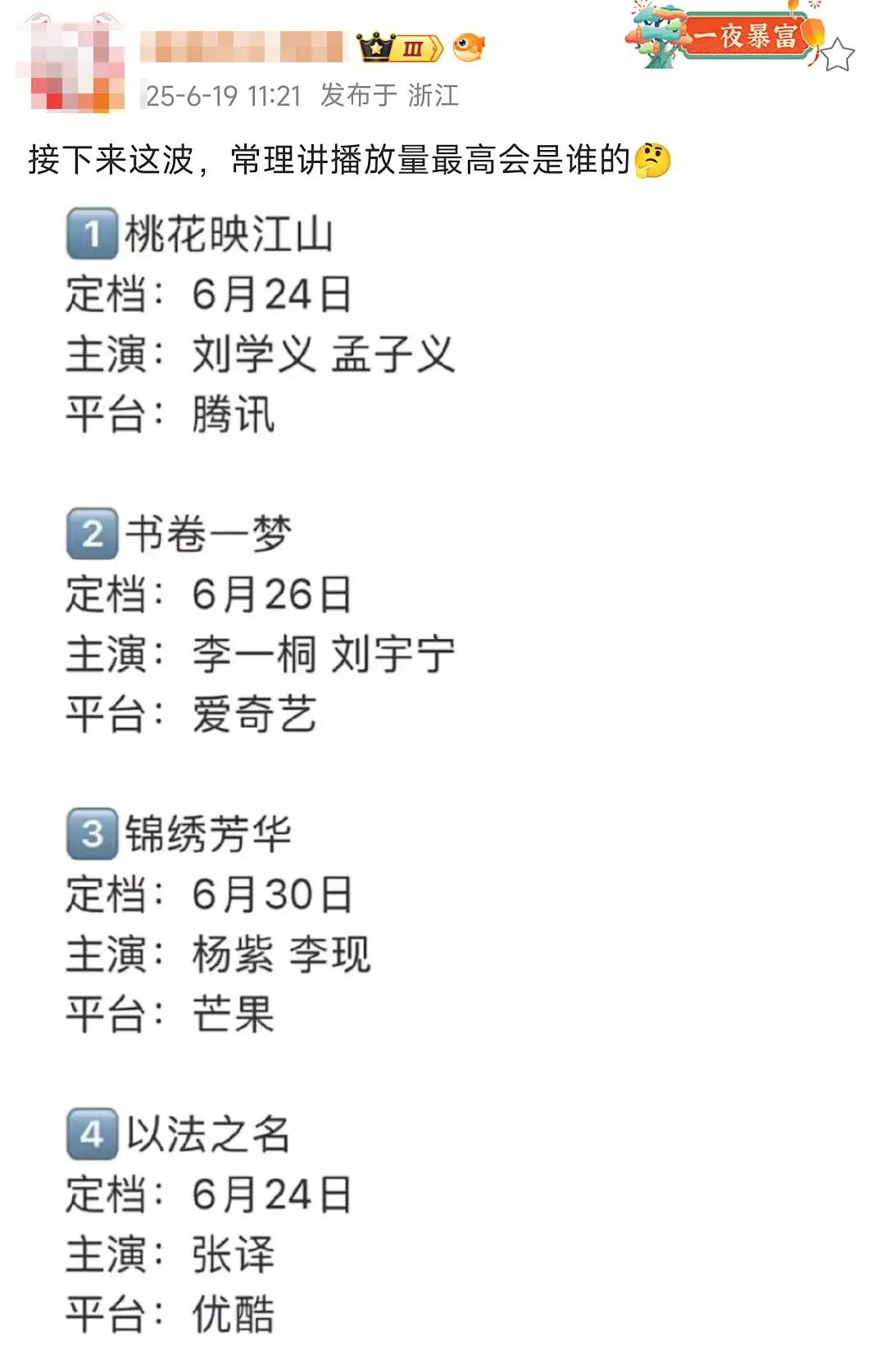 从 题材受众广度、阵容号召力、内容确定性 综合来看: